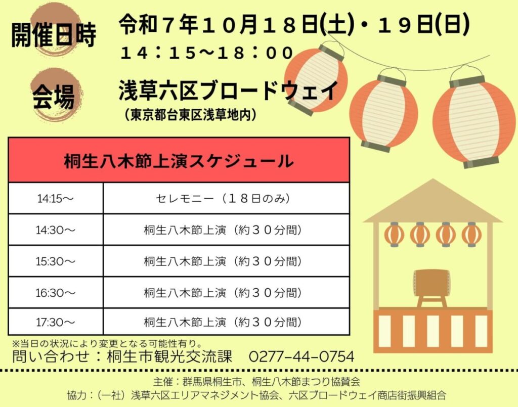 • 「桐生八木節まつりin浅草」は、桐生市最大の集客イベントである「桐生八木節まつり」を浅草六区ブロードウェイ内にて再現し、桐生市への誘客促進を図るため、桐生市および桐生八木節まつり協賛会の主催で開催します。