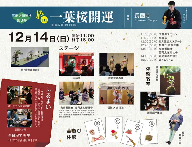 - ステージ(太神楽、和楽器演奏、葭町芸者の踊り、狐舞ひ、けん玉名人)、昔遊び体験(あやとり、けん玉、射的、富くじ)、体験教室(版画刷り、苔玉作り)、盆栽展示など。