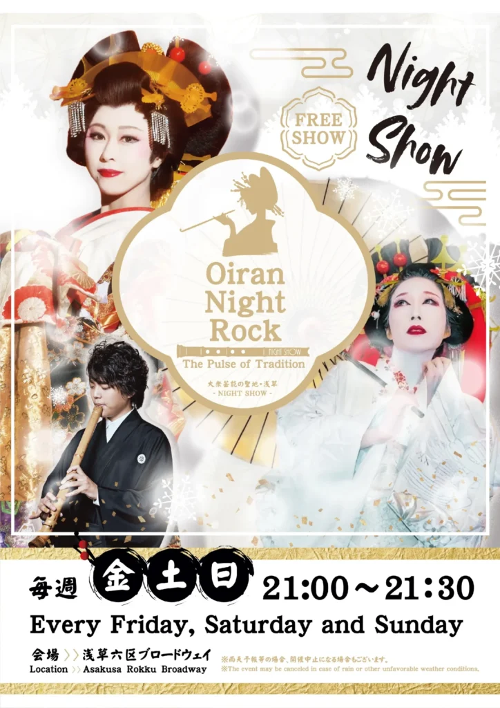- 華やかな花魁道中やダンスパフォーマンス、和楽器演奏などが無料で楽しめる、夜の浅草を彩る人気のストリートショーです。