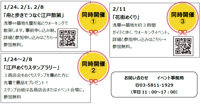 開催場所:みちびき花の辻商店会(台東区)、雷門一之宮商店会(台東区)、築地共栄商業協同組合(中央区)