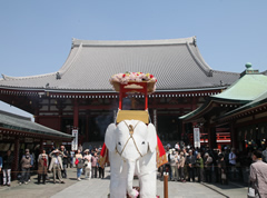 • 毎年、浅草寺では本堂に「仏誕図ぶったんず」を掛けて法要が行われ、本堂前の参道では浅草寺幼稚園園児らの行列が白象びゃくぞうをひいて誕生仏たんじょうぶつに参拝し、甘茶の無料接待などが行われて賑やかにお釈迦さまの誕生を祝う一日となります。