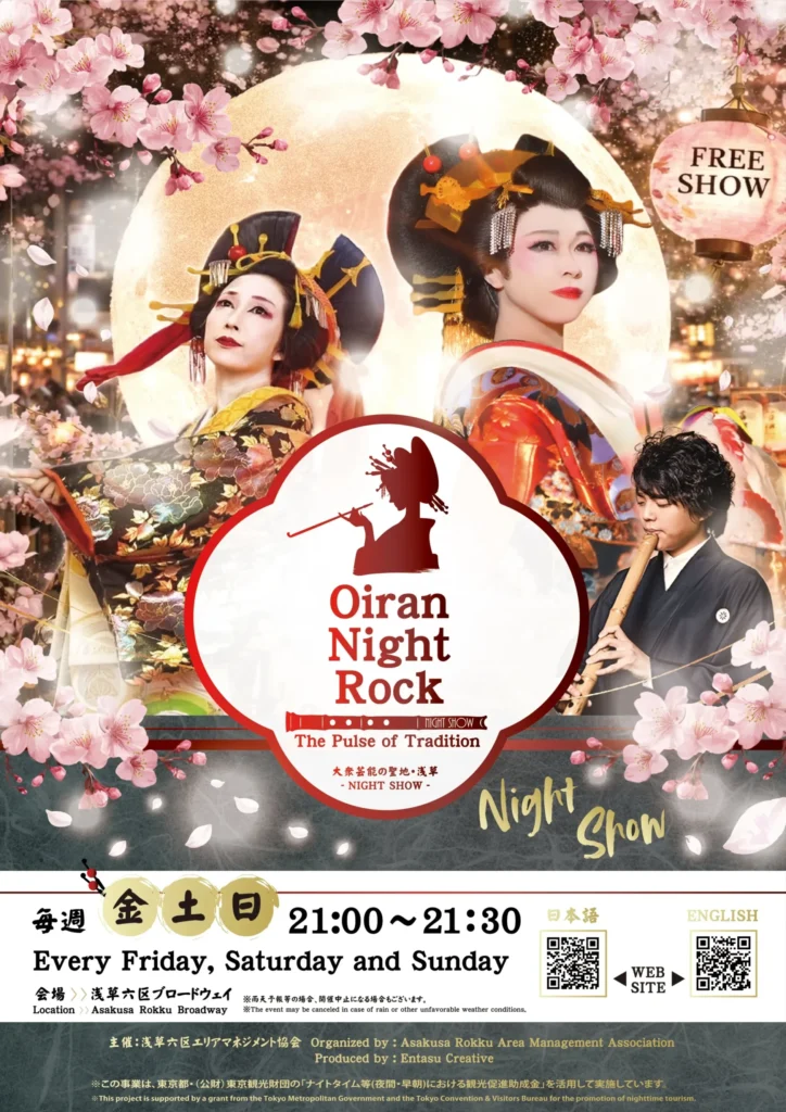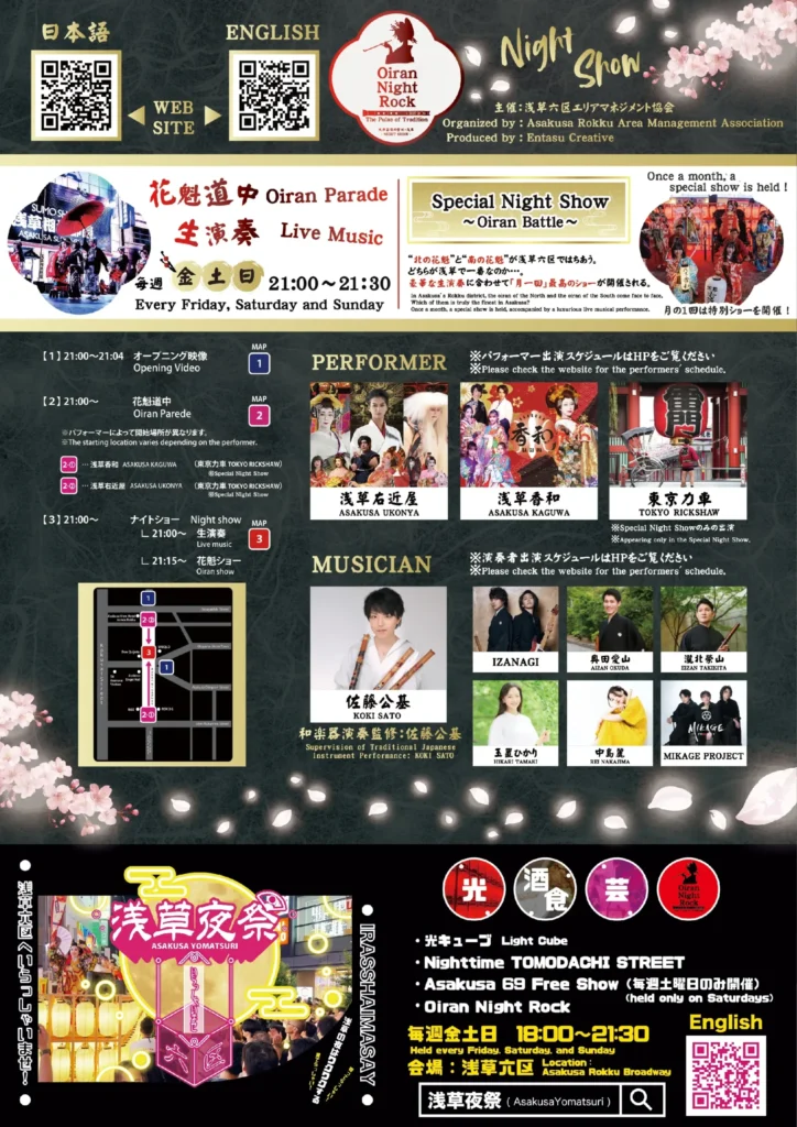 • 華やかな花魁道中やダンスパフォーマンス、和楽器演奏などが無料で楽しめる、夜の浅草を彩る人気のストリートショーです。