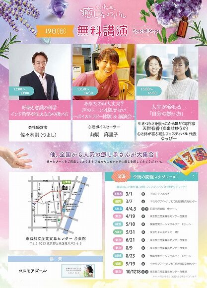 • 詳細は心と体が喜ぶ癒しフェスティバルの公式HP、レッツエンジョイ東京の公式HPをご覧ください。