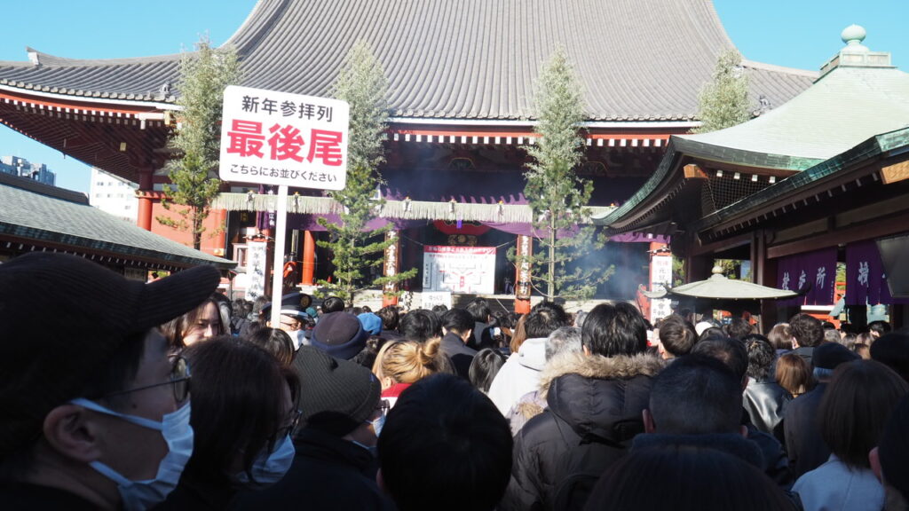浅草寺本堂が見えてくると警備員の方が「最後尾」の札を掲げていました。